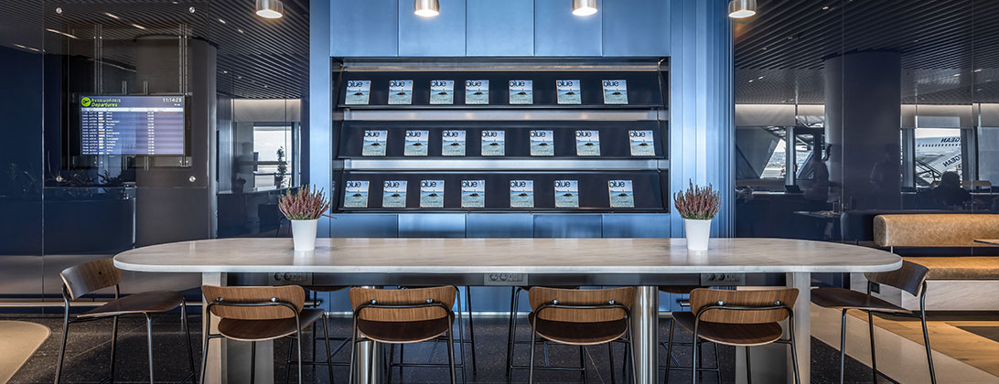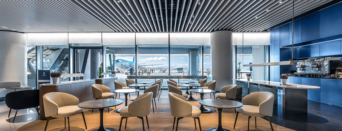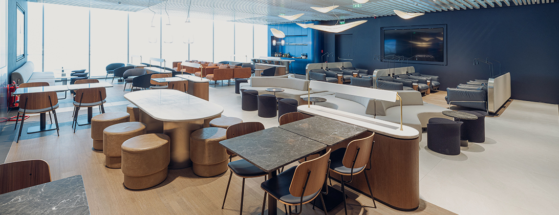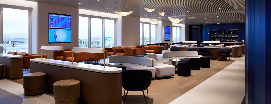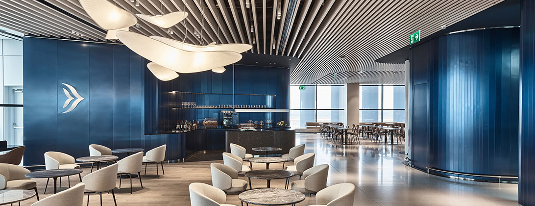 لقد استلهمنا تصميمها من العمارة اليونانية التي تجمع بين البساطة والرقي، ويعكس هذا التصميم التقنية المتقدمة لطائراتنا ويرسخ هوية علامتنا التجارية الجديدة. إن انحناءات الحواف وتناغمها وانسيابية الأشكال بالإضافة إلى المواد المستخدمة عالية الجودة مثل الرخام والتيرازو والزجاج والخشب ترسم لوحة حية ومعاصرة لمكان صمم من أجل راحتك واسترخائك.